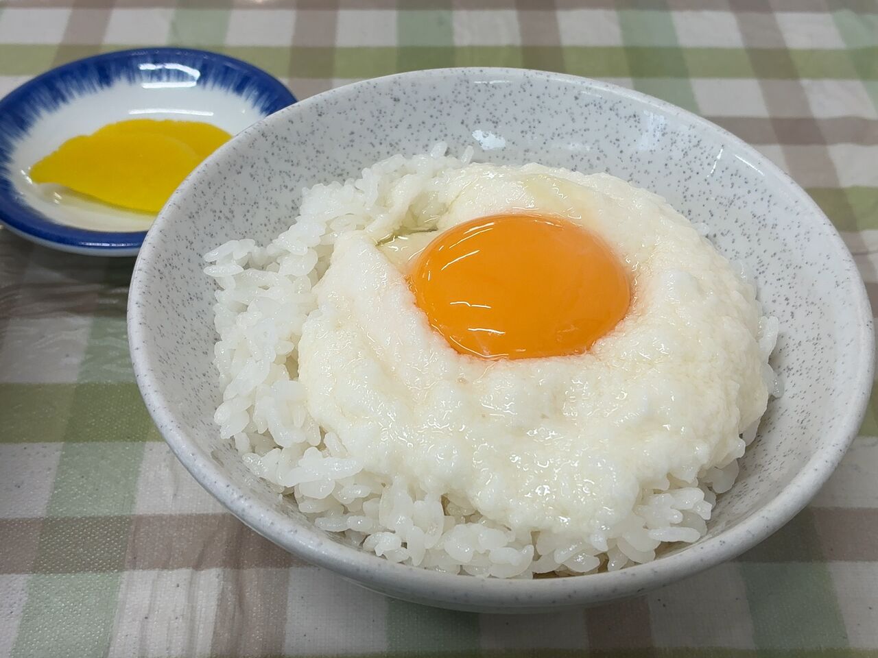 このどんぶりにテカテカかつ丼、そしてレトロなテーブルクロス…